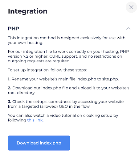 Дальше выбираем метод PHP, скачиваем файл и закидываем его на хостинг к нашей белой странице.