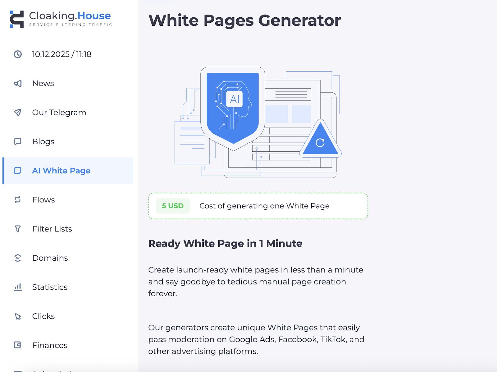 AI генератор белых страниц одна из новых функций здесь. За довольно маленькую стоимость вы получаете идеальный вайт под любую вертикаль. Настройка легкая и быстрая, каждый пункт расписан маленькими подсказками, что позволяет настроить вайт не больше чем за 10 минут. Помогает сэкономить очень много времени на создании белой страницы.