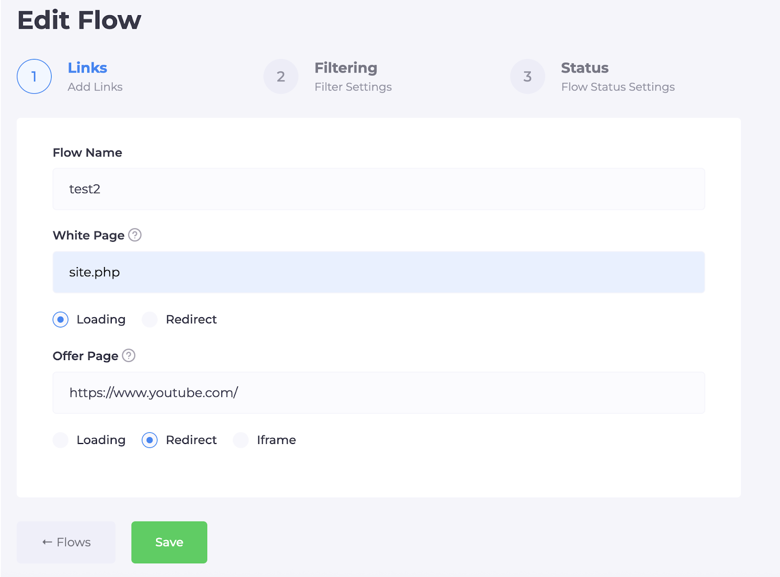 Ну и Offer page, просто вставляем сюда свой лендинг и ставим “Redirect”.