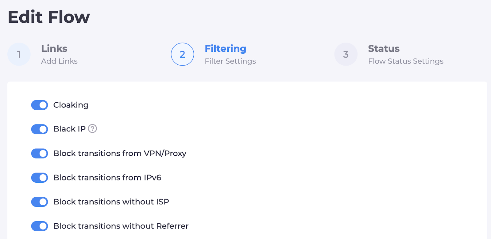 В разделе статус будут 2 статуса - пауза и активный. Готовая клоакинг на паузе не фильтрует трафик и любой клик перенаправляем на вайт пейдж. Активный включает фильтрацию траффика