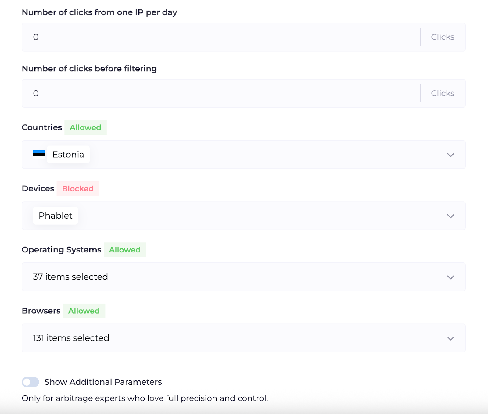 Здесь много фильтров для идеальной настройки, они все простые и понятные, обратим внимание только на первые 6 фильтров, рекомендуем оставить их включенными. Это основные фильтры которые обеспечат защиту вашей рекламы, также страну разрешаем под свой оффер, все остальные фильтры настраивайте под вас или под оффер если это необходимо.