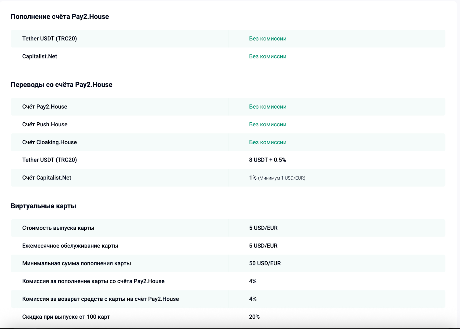 Простая и прозрачная система: комиссии и условия в Pay2.House фиксированы и одинаково удобны для всех пользователей. Вы сразу понимаете, с какими затратами работаете. Ниже представлены действующие тарифы.