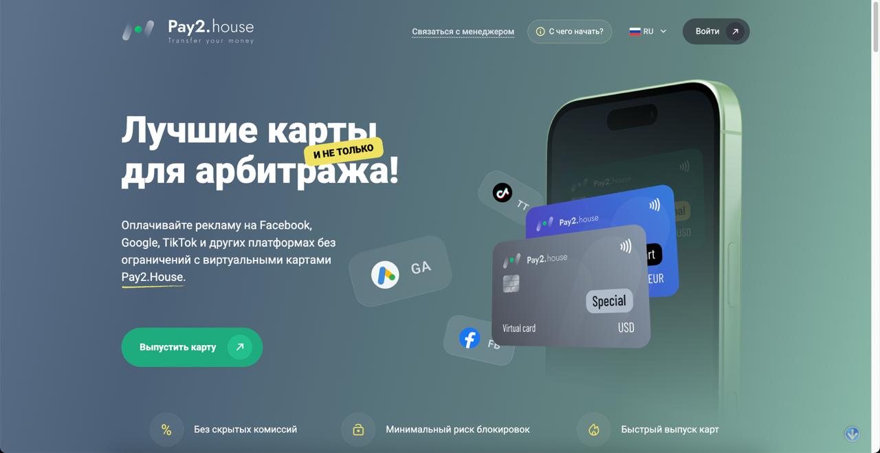 Pay2.House — это платёжный сервис с виртуальными картами, мультивалютным счётом и возможностью подключать команду. Платформа создана под задачи медиабайеров, арбитражных команд и агентств, которые работают с рекламными системами и регулярно сталкиваются с ограничениями классических карт и платёжек.